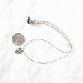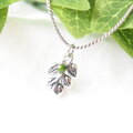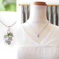 シルバーのリーフチャームにカットがキラリと輝く深いグリーンの小粒のクロムダイオプサイドを一粒添えてトップに配し、グレー色のシルクコードとライドグレー色の綿の糸を合わせたシンプルで上品な雰囲気のペンダントです。