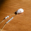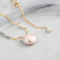 こちらは波模様が美しい中粒サイズのトムソナイトを用い、原石ダイヤと淡水パールをあわせてネックレスに仕立てました。留め具周りには小さなジルコンも使っています。アジャスター付きで、40〜45cmの長さに調整可能です。