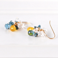 華やかな輝きを放つイエローサファイアとロンドンブルートパーズに、ブルーダイヤモンドとハーキマーダイヤモンドをたっぷりと添え、ブーケのように仕立てた贅沢なピアスです。