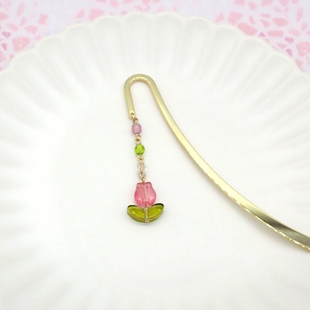 チューリップの形のチェコビーズがゆらゆら揺れる可愛いブックマーカーです。