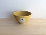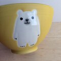 クマは陶磁器用絵具で彩色し透明釉、輪郭部分は無釉で使用した土の色です。全体にマットな黄色い釉薬を施しています。