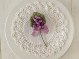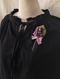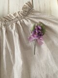 赤系のムラサキのスミレ3輪と葉をまとめて、お花と同系色の小さなくしゅくしゅリボンをつけたコサージュ。