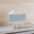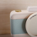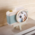 温もりのある木の質感と爽やかなライトブルーのフェイクレザーが、カフェの雰囲気を優しく彩るカメラ型フォトフレーム。
