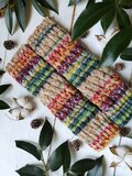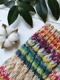 春の花をあつめた花束みたいな色合いの、手編みのスパイラル編みレッグウォーマーです。