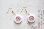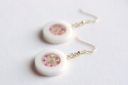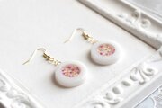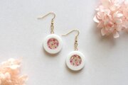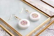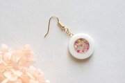 白いレジンで透明なレジンを囲み、金箔とローズピンク色のお花を散らした、華やかで上品なピアス。