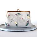 春らしい色使いのチューリップ刺繍のがま口ポーチ。化粧ポーチとして最適なサイズです。