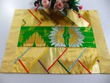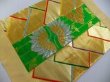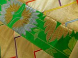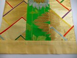 端無地部分は帯中無地(絹)を使用しています。金糸や緑地は華やかで高級感ある帯地です。