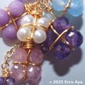 フォスフォシデライト、アメジスト、ブルーカラージェイド、ピンクカラージェイド、アマゾナイトを4個まとめて通し、花びらのイメージになるように、ワイヤーをクロスしました