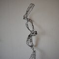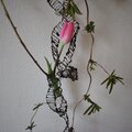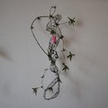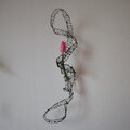 ワイヤーを梯子状に編んでリボンのようにしたものを、ランダムに絡めたような形に絡め、細い試験管を取り付けられるようにしたオブジェです。