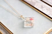 四角いレジンにコーラルピンクとオフホワイトのお花、パール、ブリオンを沈めたペンダント。
