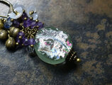 アイスグリーン美しい銀化のローマングラスとたわわなアメジスト、カイヤナイト、白蝶貝の小花、民族鈴の片耳ピアス