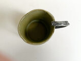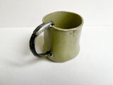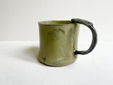 メタリックな艶に黒錆調で細めにデザインされたとってが渋いマグカップです。