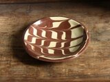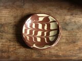 素地にクリーム状の化粧泥で模様を描いてから淡黄釉を掛けて焼成しています。