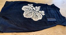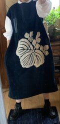 家紋古布のワンピース家紋がメインの スッキリしたデザインが とっても 素敵! 太い刺し子の糸が 家紋を 引き立てて 個性的な ワンピースの 仕上がりに。