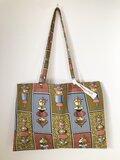 温かみのあるカラーにレンガと幾何学模様が描かれたアフリカンプリントの横長のトートバッグ(L)。