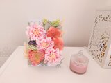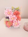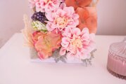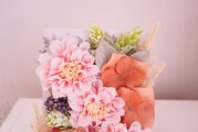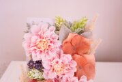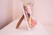 大きな明るいダリアと落ち着いた木彫のホワイトフレームがマッチしたフェミニンかつ爽やかなな雰囲気です。