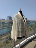 手織の布から仕立てましたカーディガンです。色は白です。材質はウールです。形は袖部分と身頃部分に分かれ、身頃部分はマフラー状です。ゆったりとしていましてサイズはフリ―です。着丈は70センチです。沢山透かし織りを入れていますのでこれからのシーズンに向いていると思います。