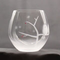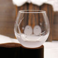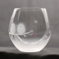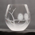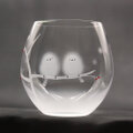 日本製の丸いタンブラーに、かわいいシマエナガたちをサンドブラスト技法で彫刻しました。