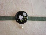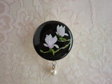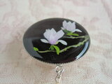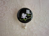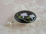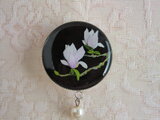 実物の地色は写真よりも少し赤みを帯びた色です。白い木蓮の花2輪を3センチの円に閉じ込めて、パールをアクセントにしました。