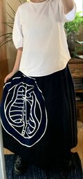 家紋古布のワンピース家紋がメインの スッキリしたデザインが とっても 素敵! 太い刺し子の糸が 家紋を 引き立てて 個性的な ワンピースの 仕上がりに。