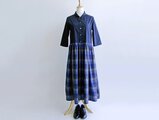 紺無地の国産のブロード生地と、青×紺×グレーの大きめチェック柄がおしゃれな、播州織・コットン100%のドビー織生地を使って、クラシックな雰囲気の七分袖ワンピースを作りました。