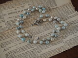 明るいブルーのイメージが強いアマゾナイトですが、今回見つけたのは少しくすんだマルチカラーのアマゾナイトで、シルバー系のコーティングを施してあるため、うっすらと銀を纏ったように見えます。全体的に見ると上品なブルーグレーのようで、とても美しい。マダムたちにピッタリです。あまりにも気に入ってしまったので、8mm玉と10mm玉を手に入れ、デザインを少しだけ変えて2本作りました。どちらにも一粒だけとびきり美しい水晶をアクセントに加えています。