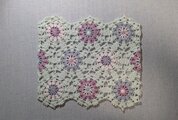 ペールグリーンの縁取りに、淡いホワイト、藤色、水色の花模様がふんわりと浮かぶデザイン。繊細な透かし編みが、春夏のコーディネートに軽やかさをプラスします。