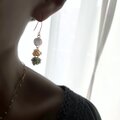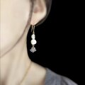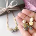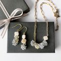 ネックレスに合わせたグレー、イエローのつぶつぶビーズと、マザーオブパールをバランスよく繋げたアシンメトリーデザインです。
