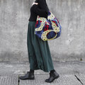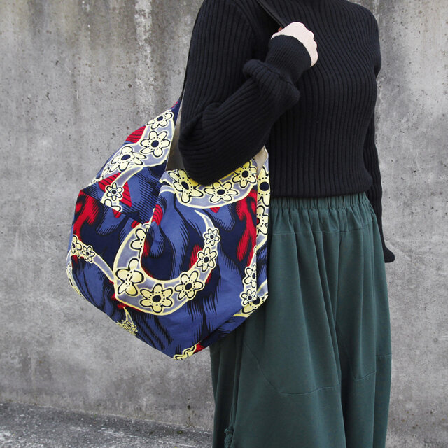 アフリカ布の魅力に実用性を備えたバッグです。裏地に帆布を合わせた丈夫な作りで、荷物を出すと八角形の形になって折りたたむことも可能です。
