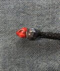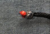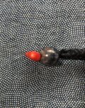 中綿を入れ、綿の男絣の着物で作ったループを付け、ループの先にアクアマリンの玉と山サンゴを付けています。