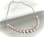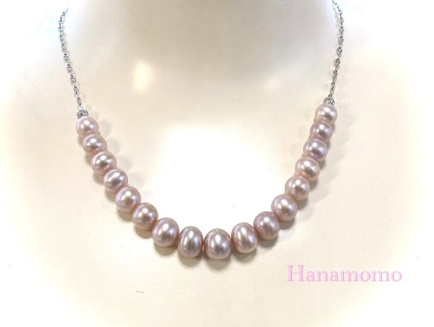 華やかで軽やかです。可愛く清楚なピンク色のパールをシルバーのチェーンでつないだネックレスです。何気ないシンプルな作りですが、着けてみますとしっくり馴染むこと間違いなしのオススメ品です。