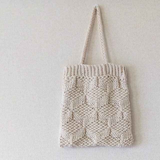 極太のコットン糸をザクザク編んだ手編みのニットバッグ。