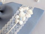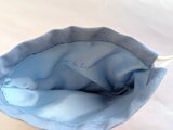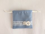 ブルーの生地に白いレースとお花を飾った ミニ巾着です。
