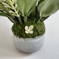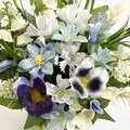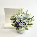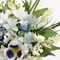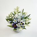 ◇アーティフィシャルフラワーで、ライトグレーの陶器の花器にアレンジしました、ミニサイズの仏花です