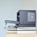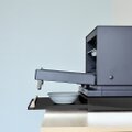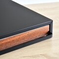 炊飯器やオーブンレンジなどの重量家電にも対応します。また、サイズは約幅45×奥行36.5cm(取手含む39cm)で、一般的なキッチンボードにもすっきり収まる設計です。素材には、マットブラックに塗装されたボンデ鋼板と、前面にあしらわれた天然木ウォルナット積層合板を使用。