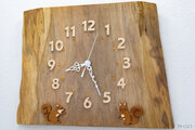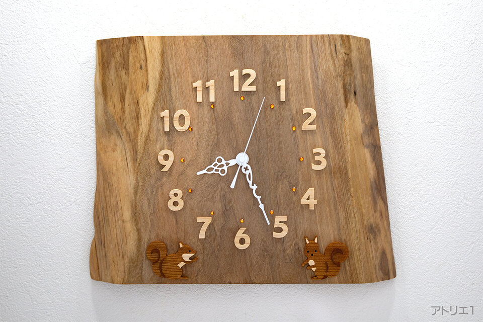 落ち着いた色合いと重厚な木目から、高級家具材や工芸材に用いられてきた胡桃(くるみ)の木の形をそのまま残し、下部にかわいいリスを配置した掛け時計です。