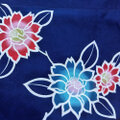 濃い藍色にダリアのような大輪の花がポンポンと咲いています。