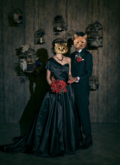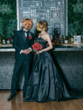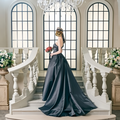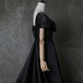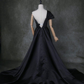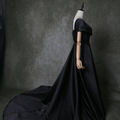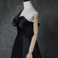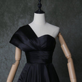 実例写真!パーティードレス ブラック ワンショルダー 光沢サテン ファスナー くるみボタン 前撮り