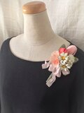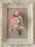 チューリップとパンジーをメインに様々なお花をまとめてリボンをつけた可愛いピンクのコサージュ。