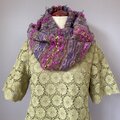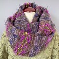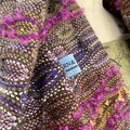 味わいのある末枯れた冬の庭に咲くバラのように、シックで落ち着いたアースカラーにバイオレットのモヘアループ糸で華やかさを織りこみました。