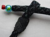 男絣の着物で作ったループを使い、紅サンゴ、先端にトンボ玉山サンゴ、牛骨の干支、ループの端にトンボ玉と山サンゴを付けています。