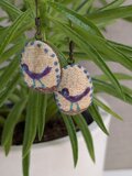 アンティーク風なデザインの中で、紫と青緑の鮮やかな羽が、