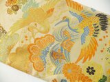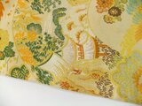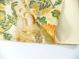 ベージュ地に飛鶴や神社仏閣、菊や笠松などの吉祥文様です。優しい色合いで色糸が鮮やかで美しいです。