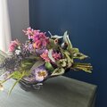 色鮮やかなブルー系の紫陽花が一足早く部屋の中で咲いたようで、部屋が一段明るく華やぎました。 とても素敵なブーケを作って頂き、どうもありがとうございました!