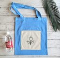 大きめのマチなしトートバッグにチューリップを刺繍した大きなポケットを付けました。手縫いで丁寧に刺しています。刺繍の裏面は引っ掛かりがないように接着芯を貼りました。