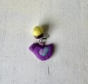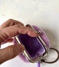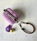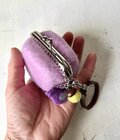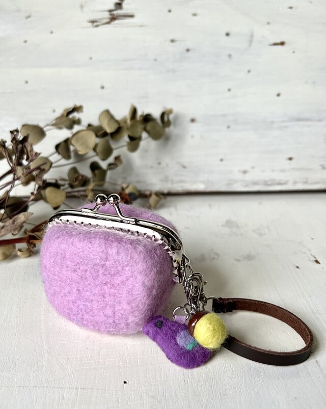 手のひらサイズの球体の羊毛フエルトがま口で、バックの外付けができるタイプです。