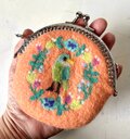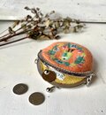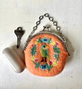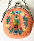 可愛らしいお花のリースと小鳥の刺繍が施されたま口が、目を引くアイテムです。