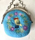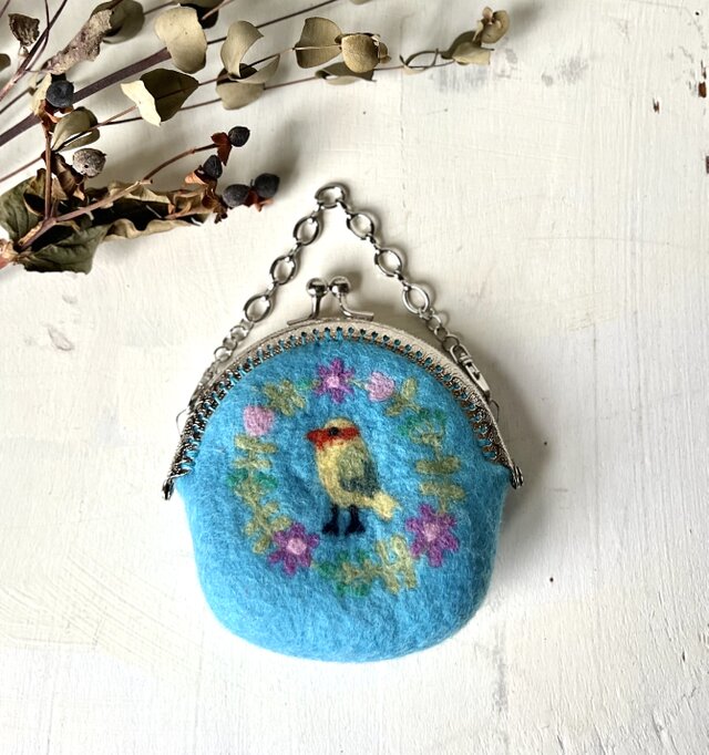 可愛らしいお花のリースと小鳥の刺繍が施されたま口が、目を引くアイテムです。