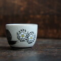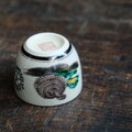 、手描きならではのペイントの移り、窯傷や経年の擦れ、器の形の歪み、黒点、凹凸、ピンホール、フリモノ、釉抜け等があります。