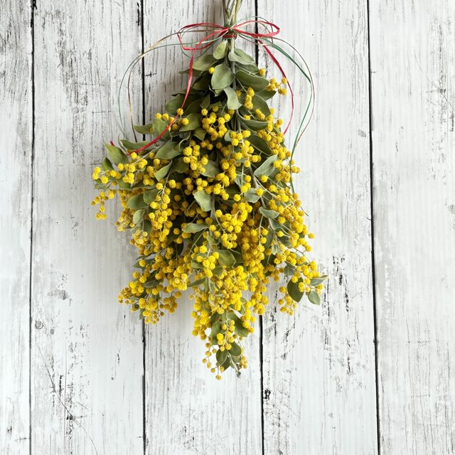 見るだけで心が弾むような鮮やかな黄色のミモザのスワッグです。